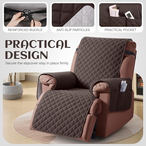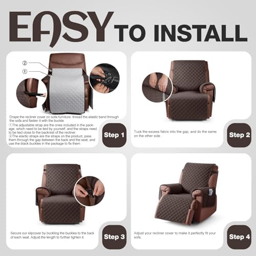 The back of the recliner cover features a new upgraded anti-slip design with large particles to significantly reduce any sliding. Easy to apply, simply drape the cover over your recliner, tuck the excess fabric between the back and cushions, and use the elastic straps to secure the slipcover in place.
